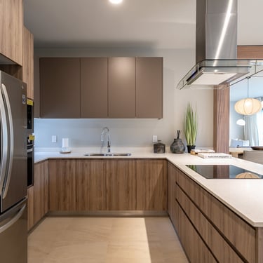 🍽️ Cocina moderna con barra de cuarzo y carpintería en tonos claros